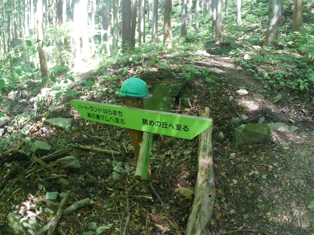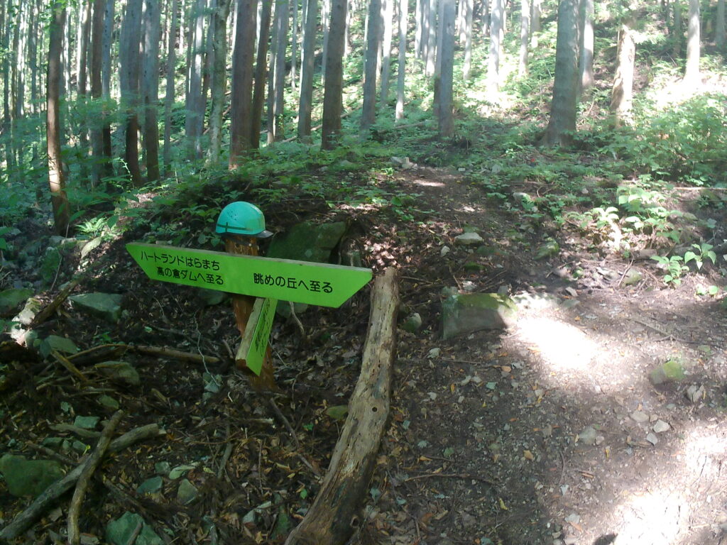 左写真の緑ヘルメットのある分岐まで来ました。写真奥側から登ってきた形になり、左へ行くと眺めの丘へ。直進すると沢ルートで山頂