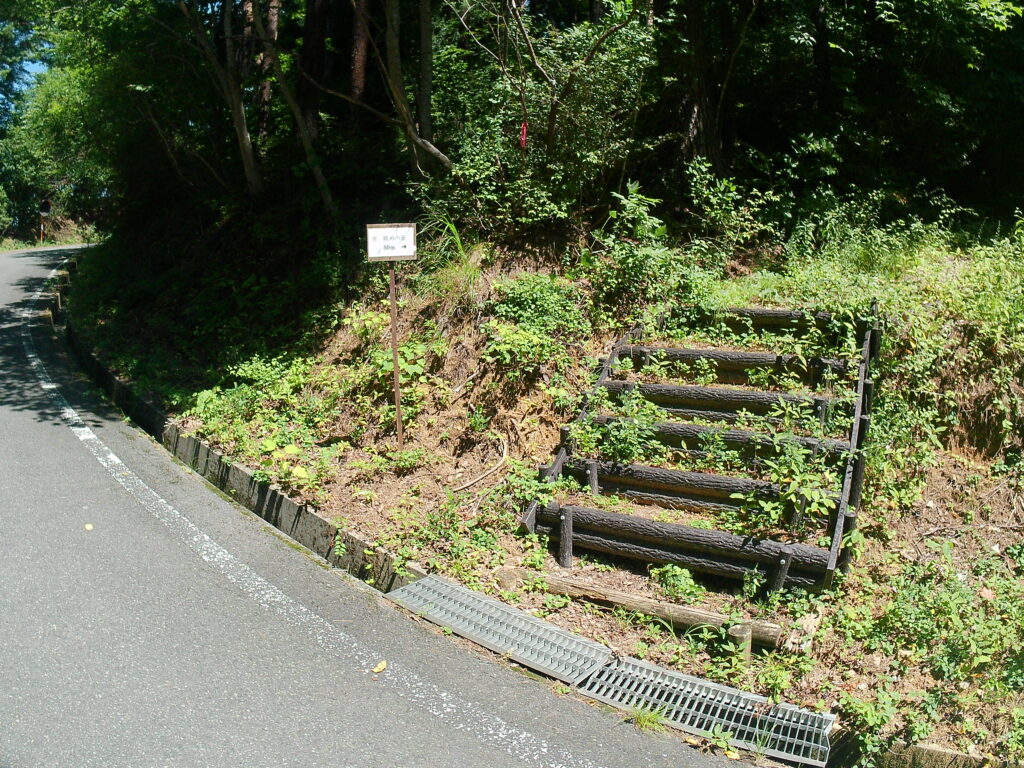 駐車場から舗装路を横断して登山口となる階段へ。看板ある為見落としはなさそうです