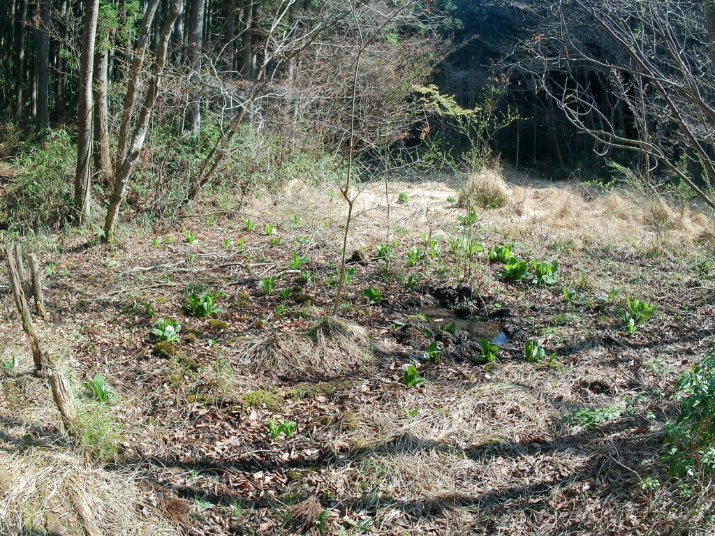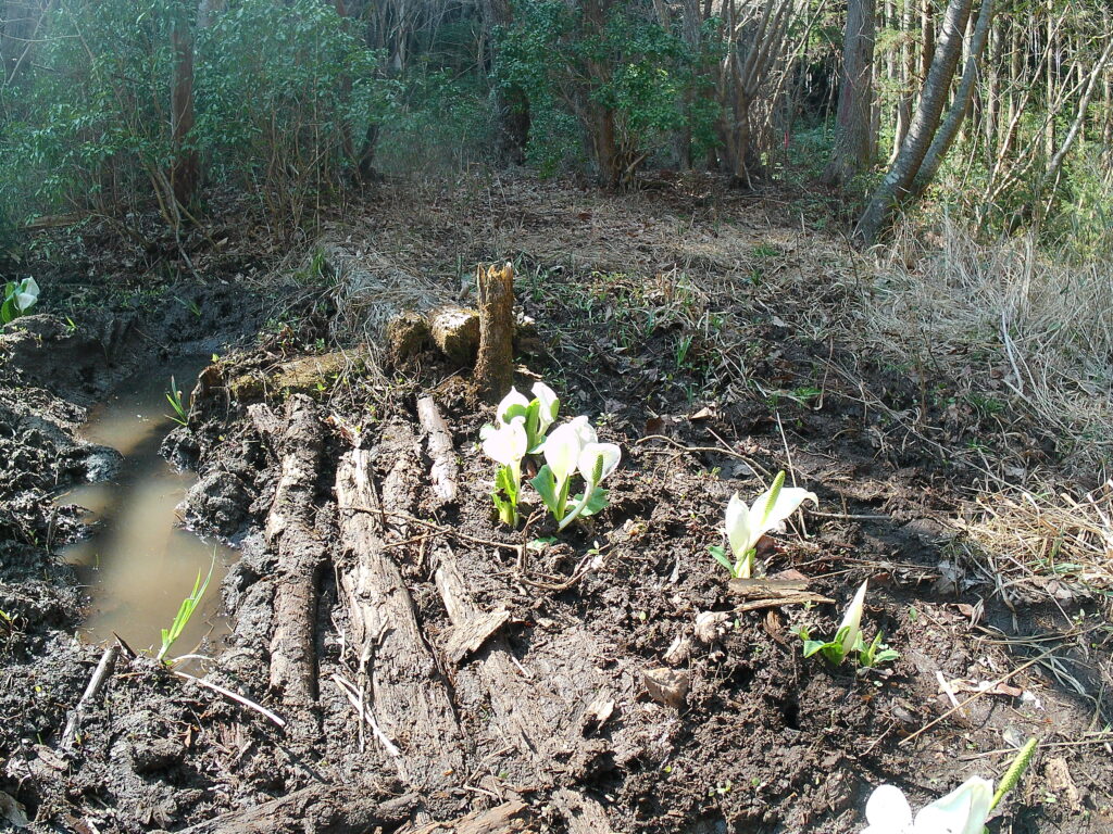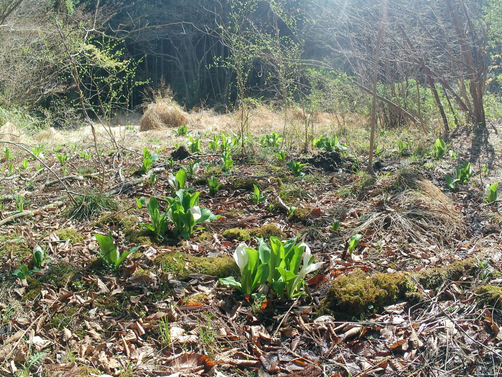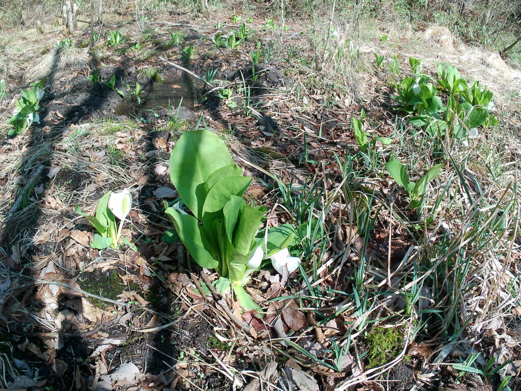 湿原らしい水場ははっきり分かりませんが、特有の植物の水芭蕉が居場所を主張しています